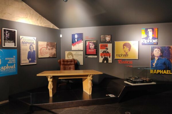 El recorrido avanza hacia los años setenta, etapa considerada por muchos como la consolidación definitiva del artista. Esta década recibe un tratamiento especial en el museo, que exhibe carteles promocionales de películas como «Sin un adiós», «Rafael en Raphael» y «Volveré a nacer», junto con fotografías icónicas del cantante apareciendo en el Ed Sullivan Show o interpretando «Balada de la trompeta». Entre las piezas expuestas, destaca una cámara fotográfica utilizada por Raphael durante su incursión como aficionado a la fotografía, algunas imágenes capturadas por él mismo y publicidad relacionada con su primera temporada en el Flamingo Hotel de Las Vegas. También se encuentra un tocadiscos portátil que solía llevar consigo en sus viajes, junto a un disco de Jacques Brel, uno de sus artistas predilectos; carteles de sus primeras giras internacionales por países como la Unión Soviética, Japón y Australia; e incluso una mesa adquirida para su despacho en Nueva York que posteriormente trasladó a Madrid y usó hasta poco antes de que el museo abriera sus puertas.