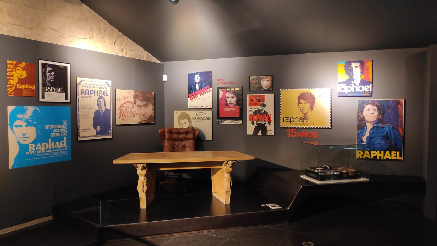 El recorrido avanza hacia los años setenta, etapa considerada por muchos como la consolidación definitiva del artista. Esta década recibe un tratamiento especial en el museo, que exhibe carteles promocionales de películas como «Sin un adiós», «Rafael en Raphael» y «Volveré a nacer», junto con fotografías icónicas del cantante apareciendo en el Ed Sullivan Show o interpretando «Balada de la trompeta». Entre las piezas expuestas, destaca una cámara fotográfica utilizada por Raphael durante su incursión como aficionado a la fotografía, algunas imágenes capturadas por él mismo y publicidad relacionada con su primera temporada en el Flamingo Hotel de Las Vegas. También se encuentra un tocadiscos portátil que solía llevar consigo en sus viajes, junto a un disco de Jacques Brel, uno de sus artistas predilectos; carteles de sus primeras giras internacionales por países como la Unión Soviética, Japón y Australia; e incluso una mesa adquirida para su despacho en Nueva York que posteriormente trasladó a Madrid y usó hasta poco antes de que el museo abriera sus puertas.